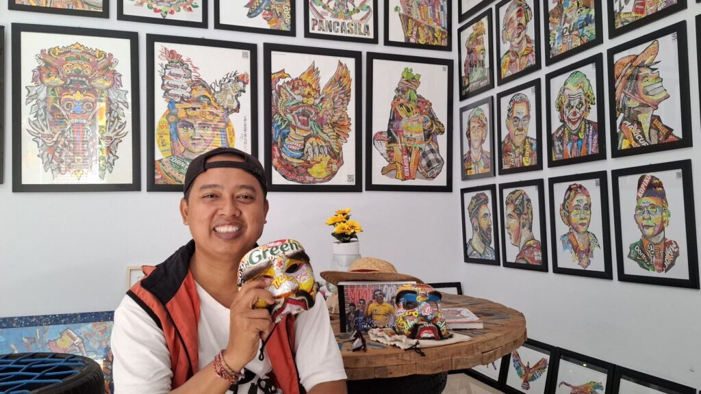 Di dalam bangunan yang digunakan untuk galeri itu, seorang pria duduk di kursi berbahan ban mobil bekas. Kedua tangannya, memegang sebuah topeng yang berbeda dengan biasanya. Topeng itu terlihat berwarna warni, bukan dari cat. Melainkan topeng itu ditempeli bekas plastik makanan ringan, hingga membuatnya menjadi berwarna. Dia sedang membersihkan topeng di tangannya.