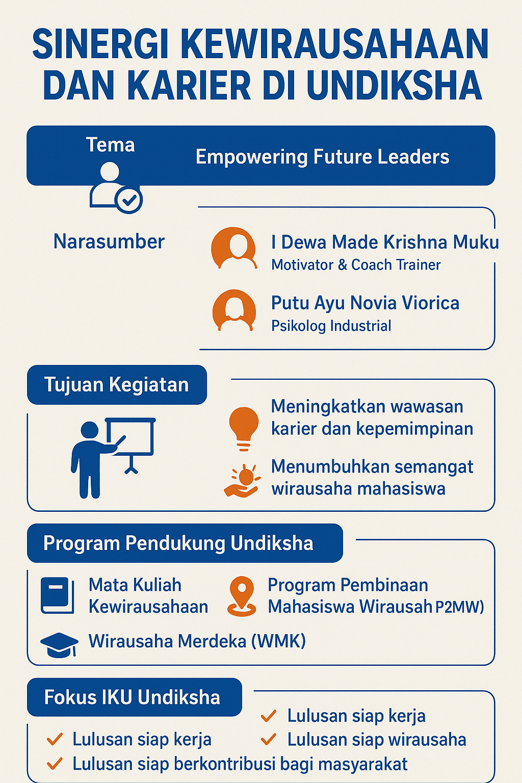 Wakil Rektor Bidang Kemahasiswaan, Alumni, dan Hubungan Masyarakat, Prof. Dr. I Ketut Sudiana, M.Kes., menegaskan kegiatan ini sejalan dengan arah pengembangan kampus menuju pencapaian Indikator Kinerja Utama (IKU). Fokus utama Undiksha, kata dia, adalah mencetak lulusan yang siap kerja, siap berwirausaha, dan siap berkontribusi bagi masyarakat. “Melalui kegiatan seperti ini, mahasiswa mendapatkan bekal nyata tentang bagaimana membangun karir dengan mental kewirausahaan yang kuat,” ungkapnya.